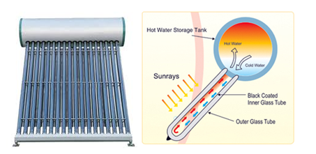 Inside most modern ETC systems there's a thin copper heat pipe running down the center of each tube, with a small amount of special fluid (usually non-toxic and low-boiling). When sunlight hits the absorber coating, it heats up the fluid inside the pipe. The fluid turns into vapor, rises to the top of the pipe (which sticks into a insulated manifold box), and there it gives off its heat to the water flowing through the manifold. The vapor cools, condenses back to liquid, and drips down to start the cycle again. This is called a heat-pipe system, and it's passive—no pump needed in most home setups.